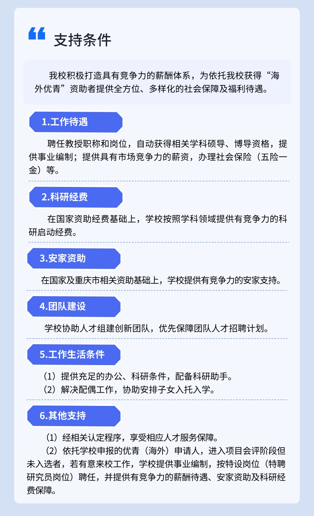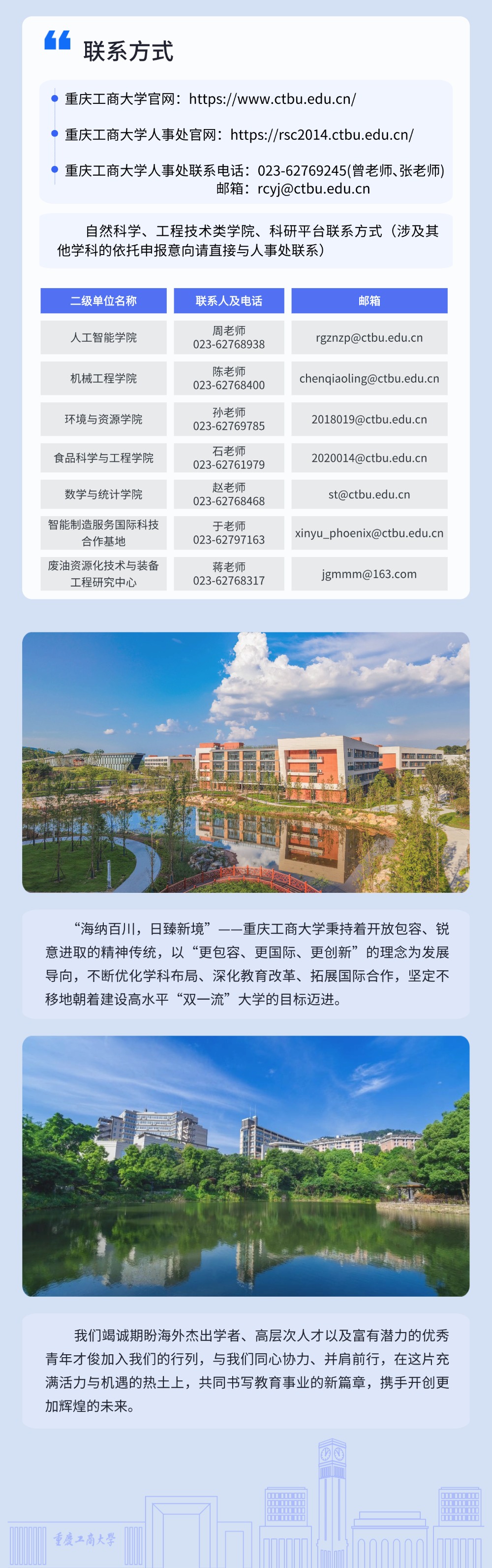 当前位置: 首页 >> 人才招聘 >> 正文 全球寻“优”,共见未来——诚邀全球英才依托重庆工商大学申报海外优青 时间:2026年01月08日 16:19 作者:人事处 下一条:2025年重庆工商大学学科专业团队师资博士后招收简章 【关闭】