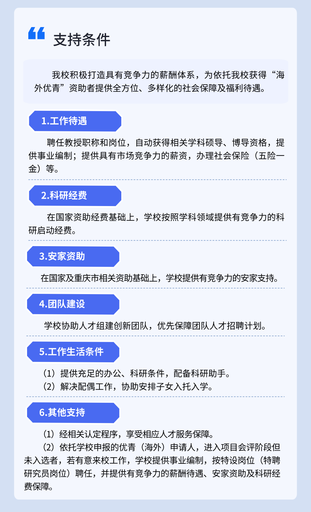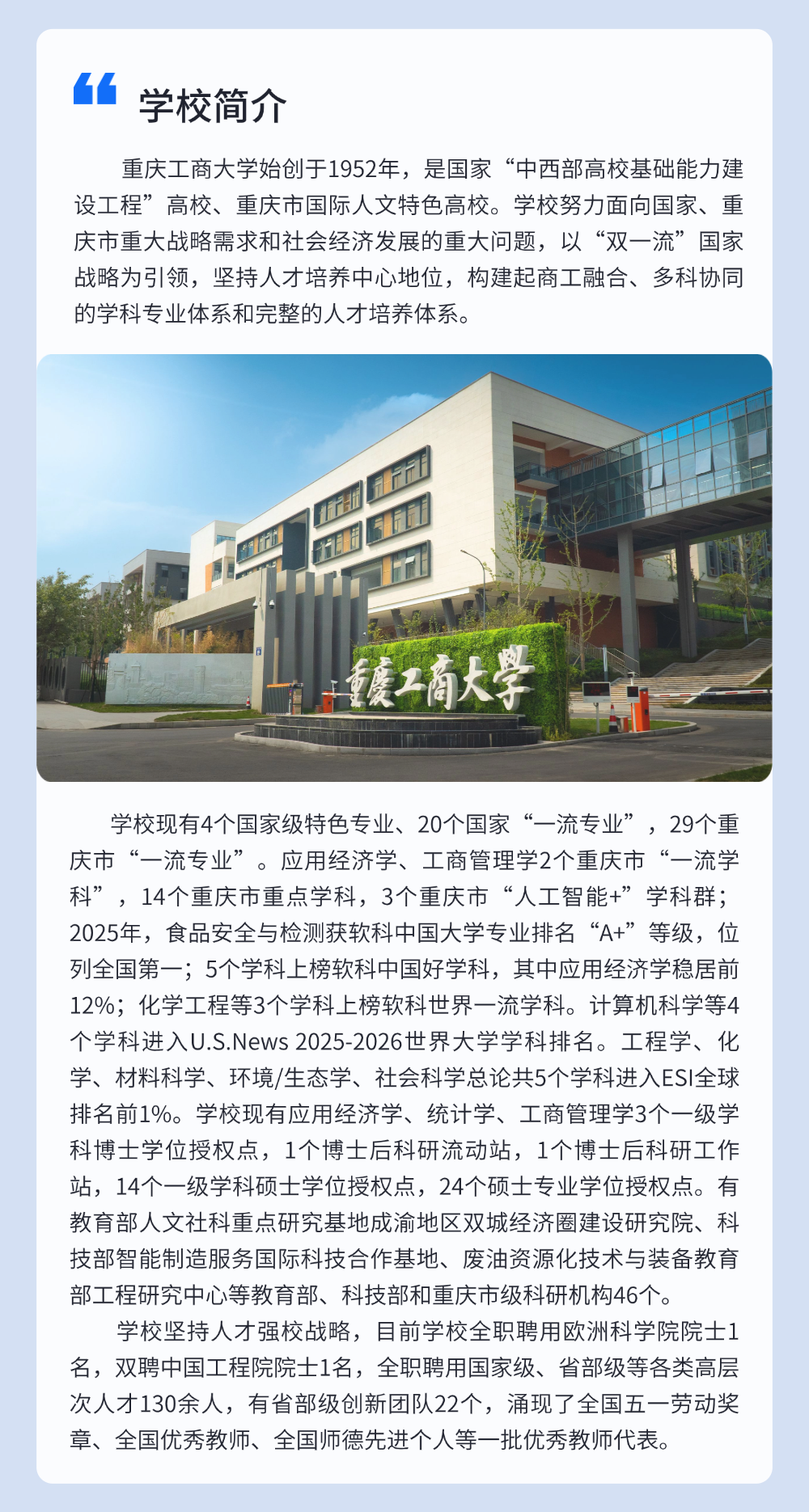 当前位置: 首页 >> 人才招聘 >> 正文 全球寻“优”,共见未来——诚邀全球英才依托重庆工商大学申报海外优青 时间:2026年02月05日 09:35 作者:人事处 下一条:2025年重庆工商大学学科专业团队师资博士后招收简章 【关闭】